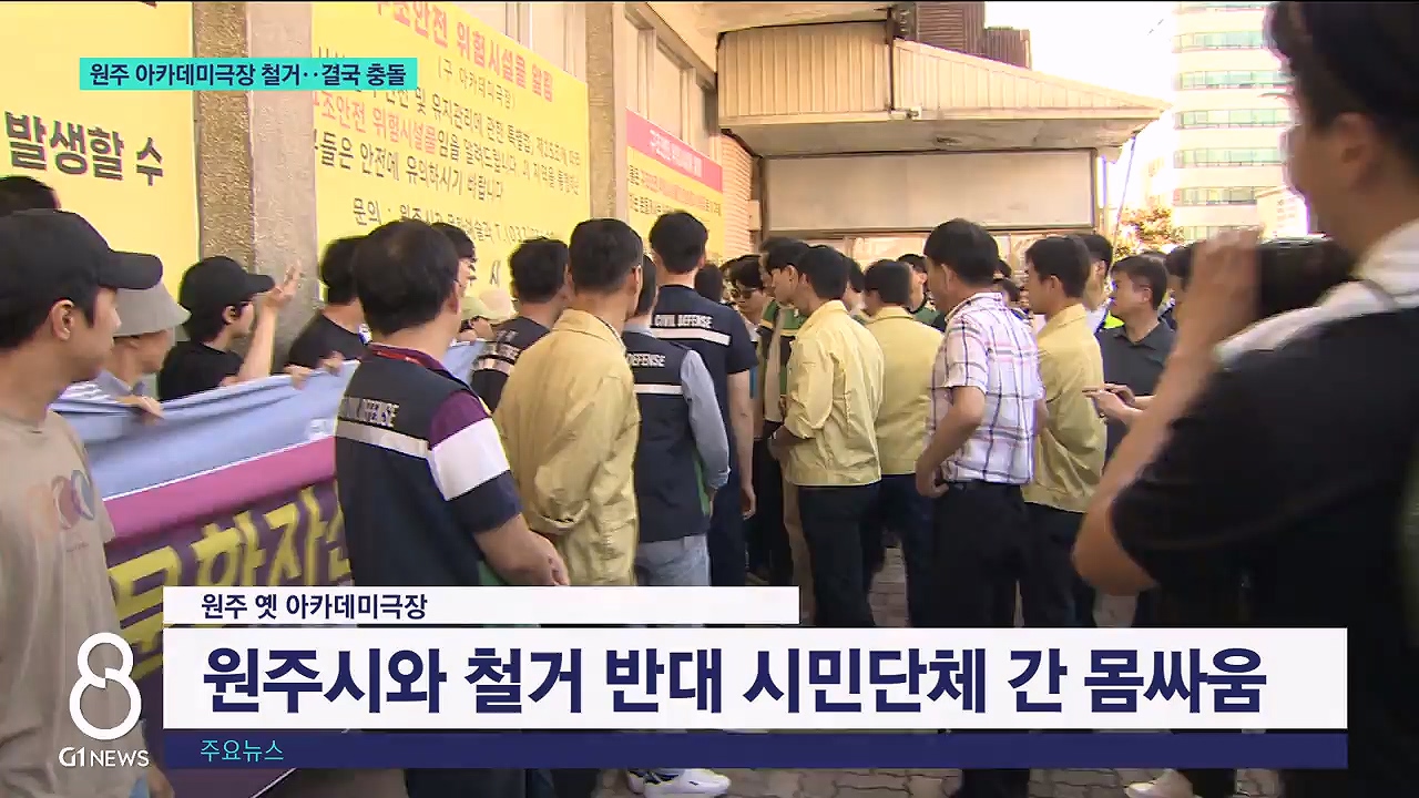 원주 옛 아카데미극장 철거를 둘러싼 지역사회 갈등이 결국 몸싸움으로 번졌습니다.