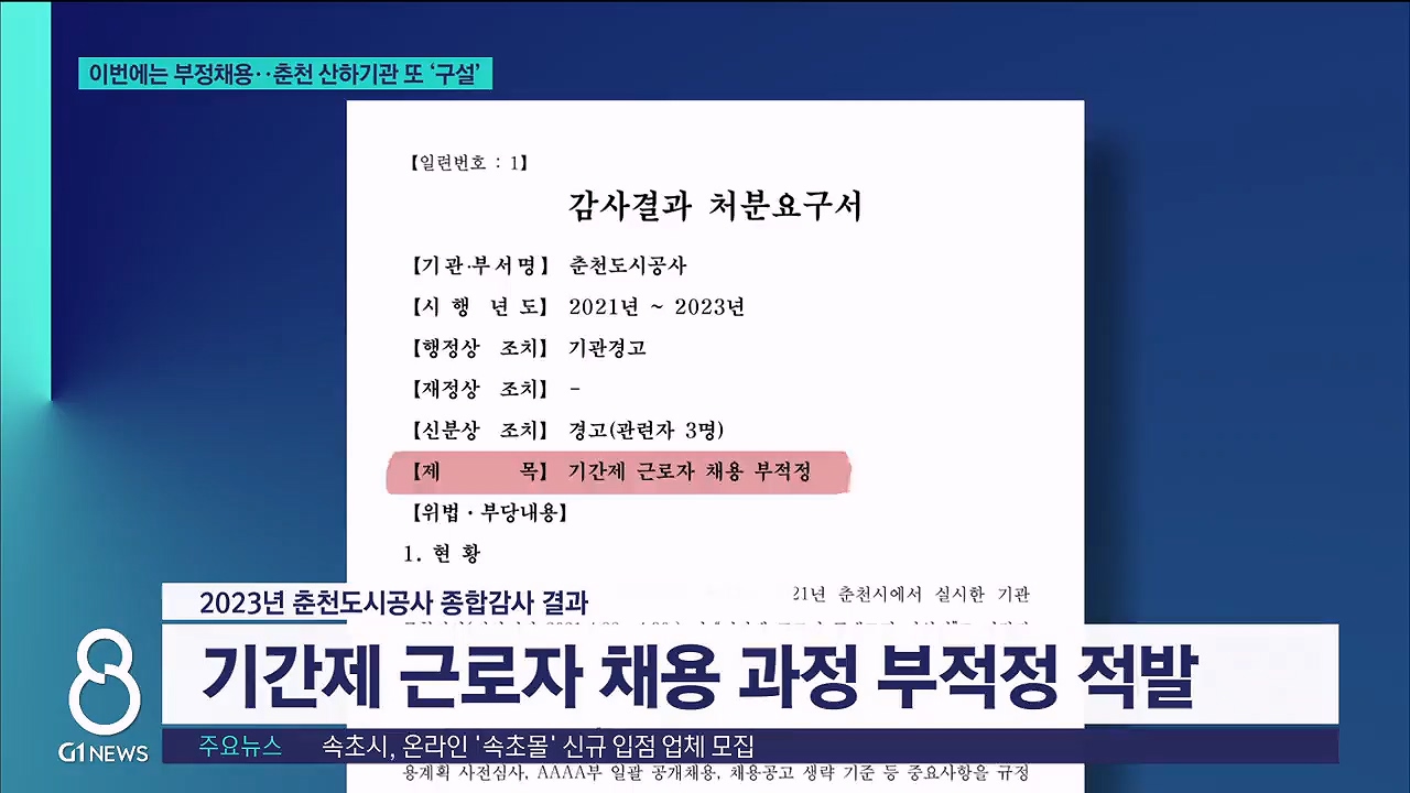 정보문화산업진흥원에 이어 도시공사까지, 춘천시 감사에서 잇따라 산하기관 문제가 터져 나오면서 지속적인 관리점검이 필요해 보입니다.
