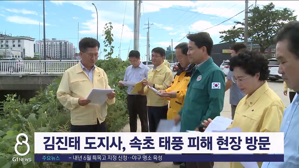 김진태 강원특별자치도지사와 도 재난안전실 관계자들이 태풍 '카눈'으로 큰 피해를 본 속초 수해 현장을 방문했습니다.