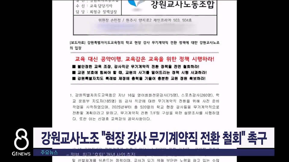 강원교사노동조합이 성명을 내고 "무기계약직 전환 정책을 전면 철회하라"고 촉구했습니다.