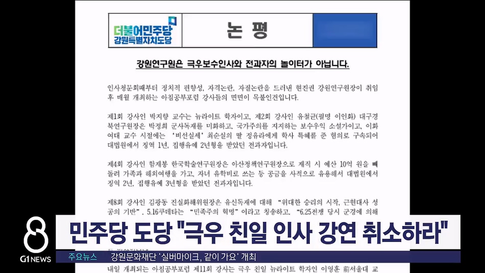 더불어민주당 도당이 논평을 내고 "강원연구원은 극우 보수인사와 전과자의 놀이터가 아니다"라고 비판했습니다.