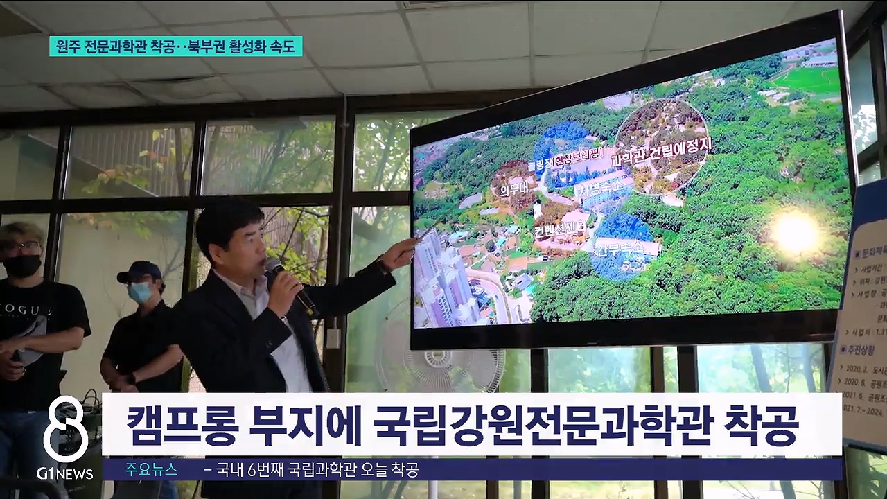 "(캠프롱) 한쪽에서는 토양을 복원하고 또 한쪽에서는 원주시민들이 원하는, 강원도의 문화 불균형을 해소할 수 있는 여러 가지 사업 시설들을 짓고 있습니다. 그 시작이 국립강원 전문과학관이라고 말씀드릴 수 있습니다."
