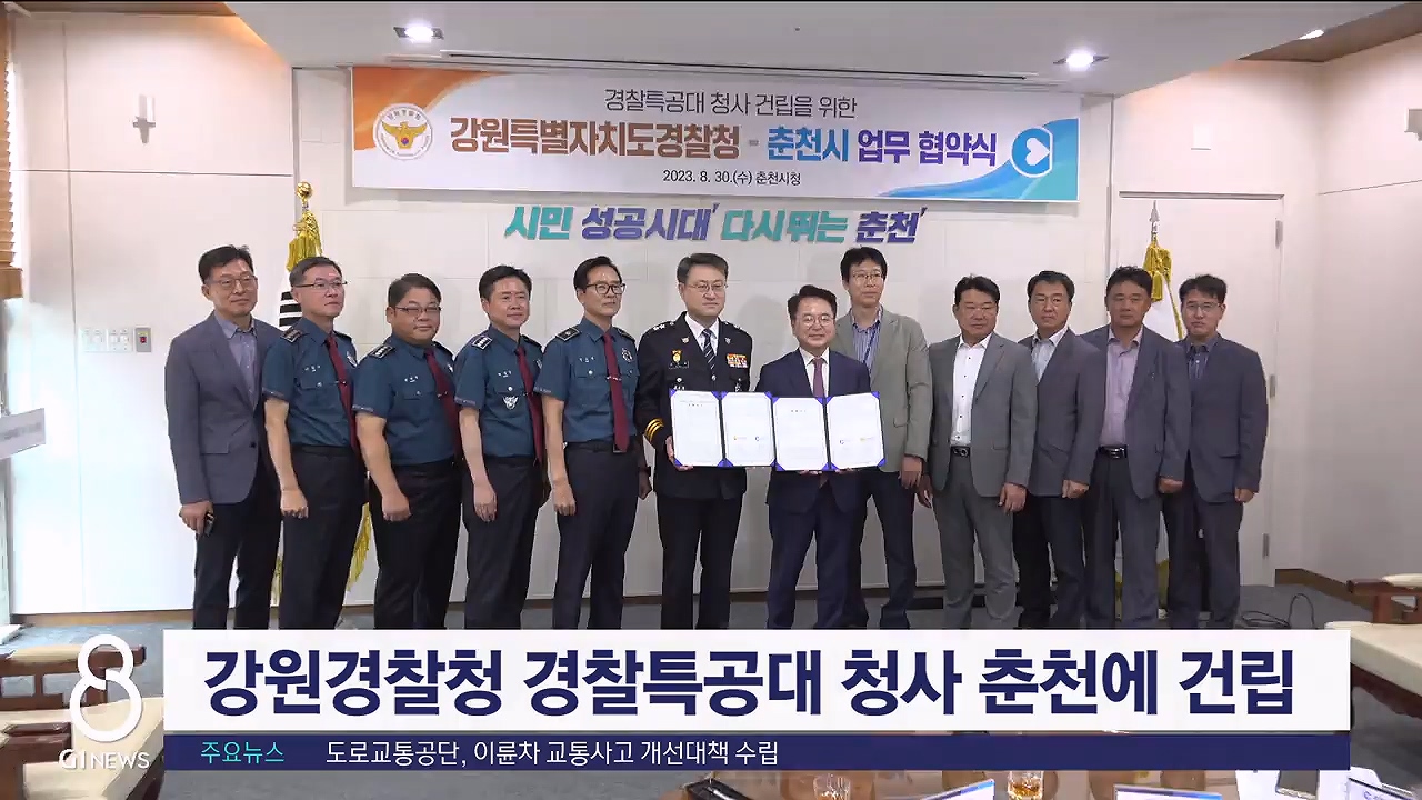 육동한 춘천시장과 김도형 도경찰청장은 오늘(30일) 춘천시청에서 '도경찰청 경찰특공대 청사건립 업무협약식'을 갖고,