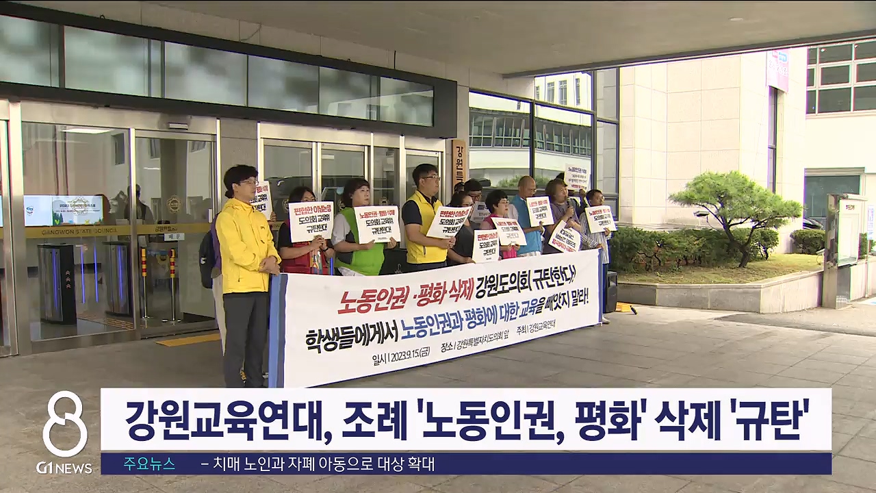 강원도의회가 최근 교육 관련 조례에서 '노동인권'과 '평화'라는 단어를 삭제한 것과 관련해, 강원교육연대가 기자회견을 열고 강력 규탄했습니다.