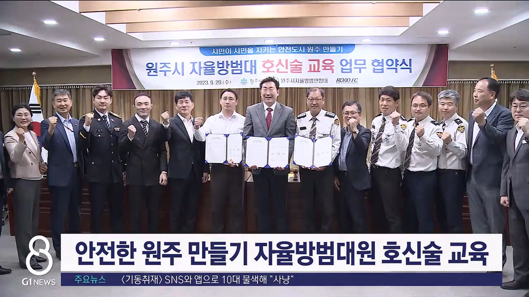 원주시는 오늘(20일) 시청 투자상담실에서 '시민이 시민을 지키는 안전한 도시 원주'를 주제로 자율방범대와 종합격투기 단체인 로드FC 간 업무 협약을 맺었습니다.