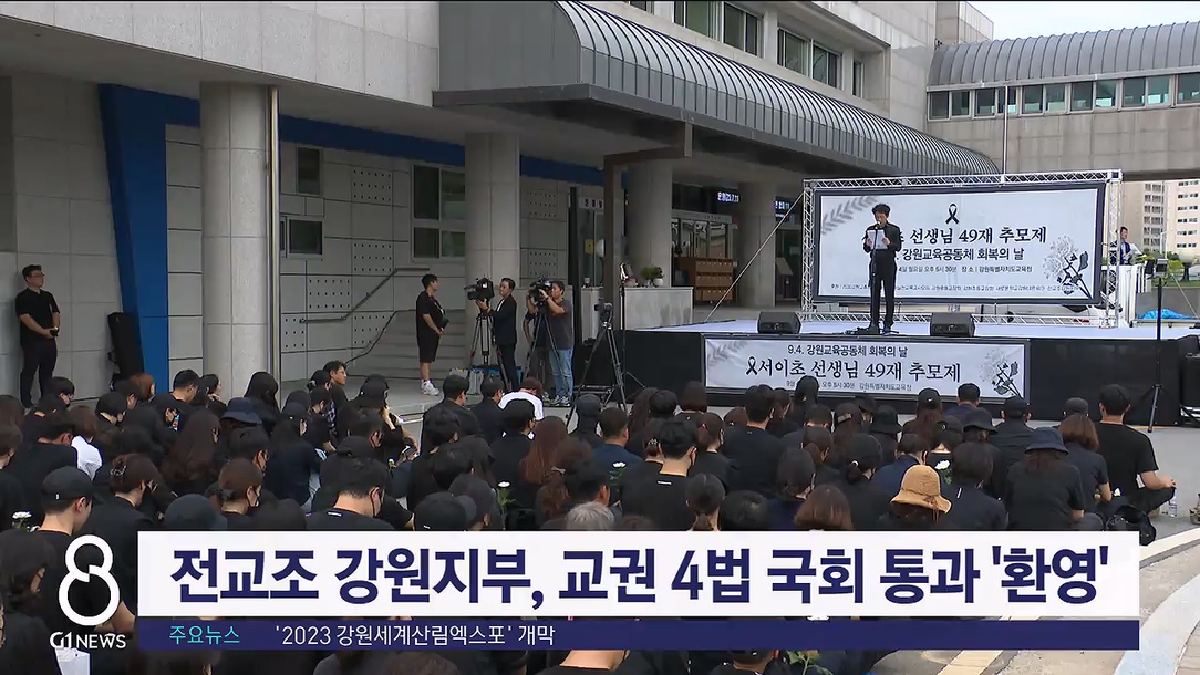 초중등교육법과 교육기본법 등 '교권보호 4법'이 어제(21일) 국회 본회의에서 1호 안건으로 통과된 것과 관련해, 전교조 강원지부가 환영의 뜻을 밝혔습니다.