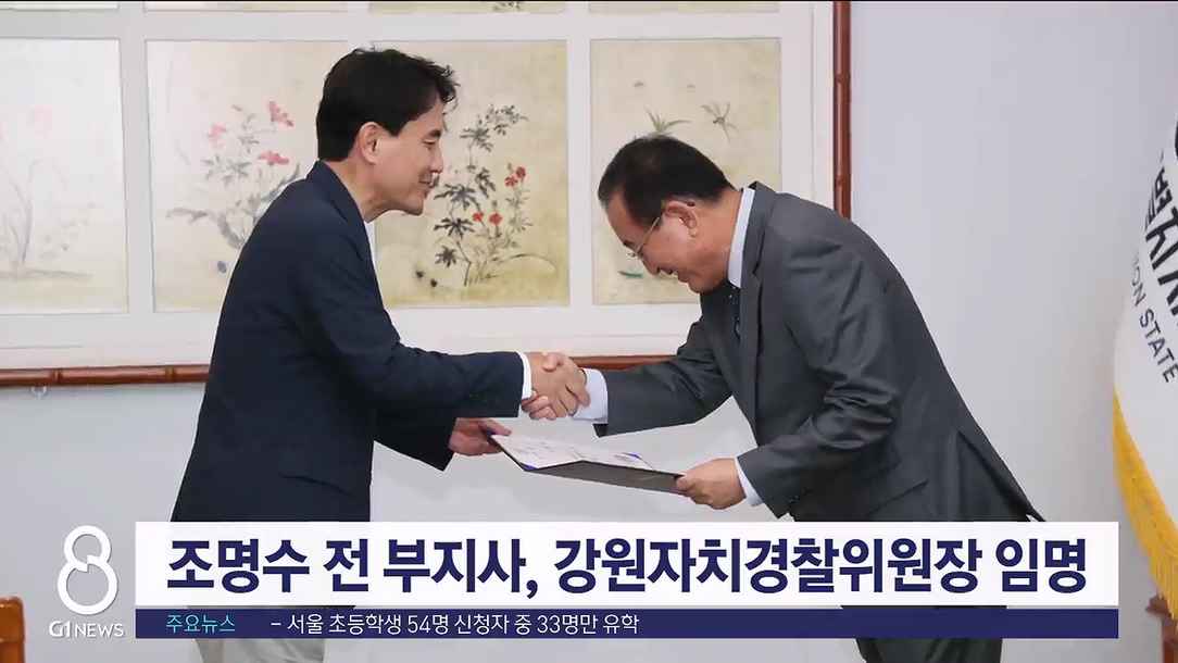 김진태 강원특별자치도지사는 오늘(4일) 도청에서 조명수 전 부지사에게 강원자치경찰위원장 임명장을 전달했습니다.