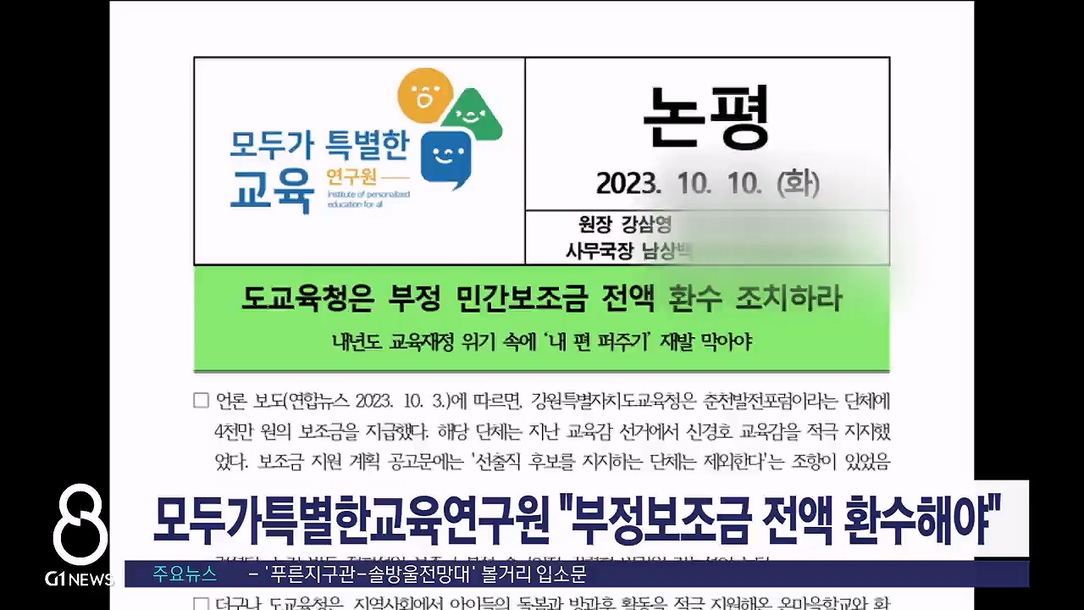 모두가특별한교육연구원은 논평을 통해 "지난 교육감 선거에서 신경호 교육감을 적극 지지했던 A단체가 4천만 원의 보조금을 받았다"며 "전형적인 보조금 부정 수급이자 권력형 비리의 가능성이 높다"고 비판했습니다.