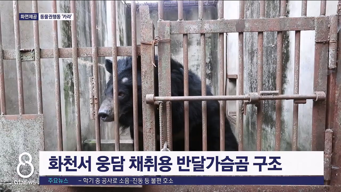 최근 화천의 한 농장에서 웅담 채취용으로 사육되던 반달가슴곰 1마리가 동물보호단체에 의해 구조됐습니다.