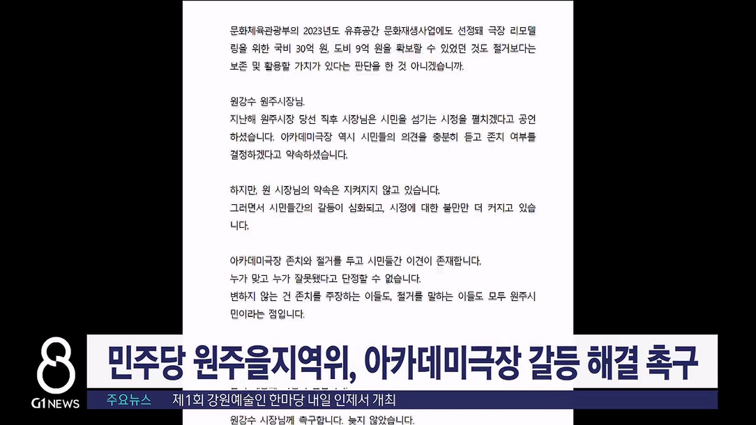 더불어민주당 원주을 지역위원회가 오늘(11일) 성명서를 내고 아카데미극장 갈등 해결을 촉구했습니다.