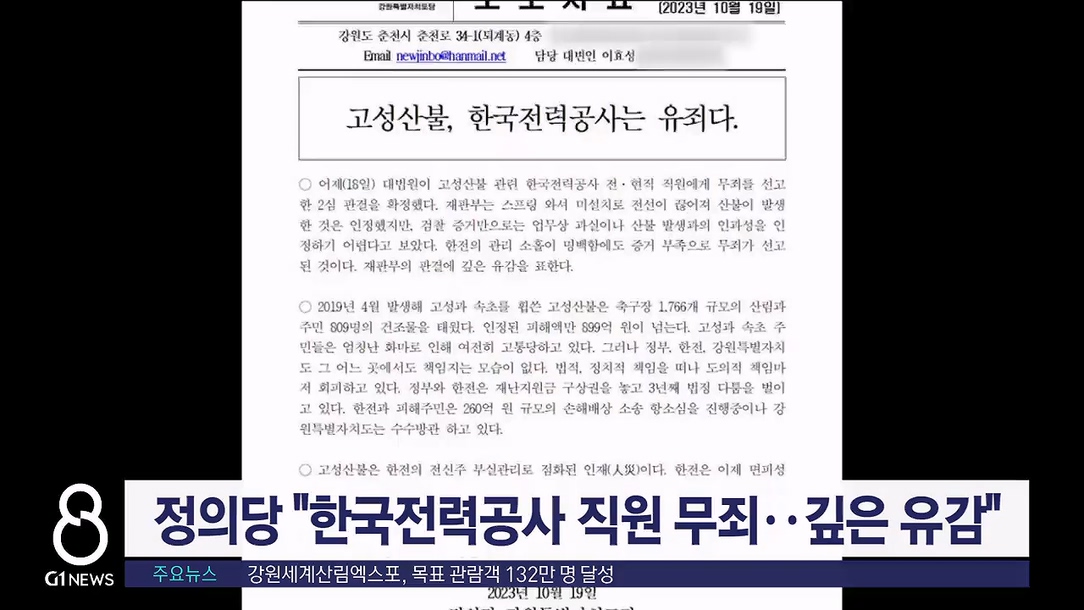 정의당 도당은 "한전의 관리 소홀이 명백함에도 증거 부족으로 무죄를 선고한 재판부의 판결에 깊은 유감을 표한다"며 "고성산불은 한전의 전신주 부실관리로 점화된 인재"라고 지적했습니다.