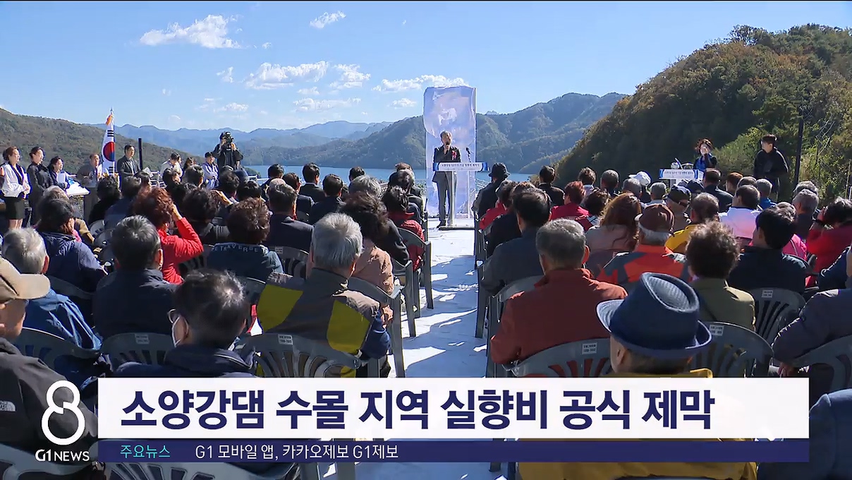 소양강댐 수몰 지역 실향민의 애환을 담은 '수몰지역 실향비' 제막 행사가 오늘(20일) 소양강댐 정상에서 열렸습니다.