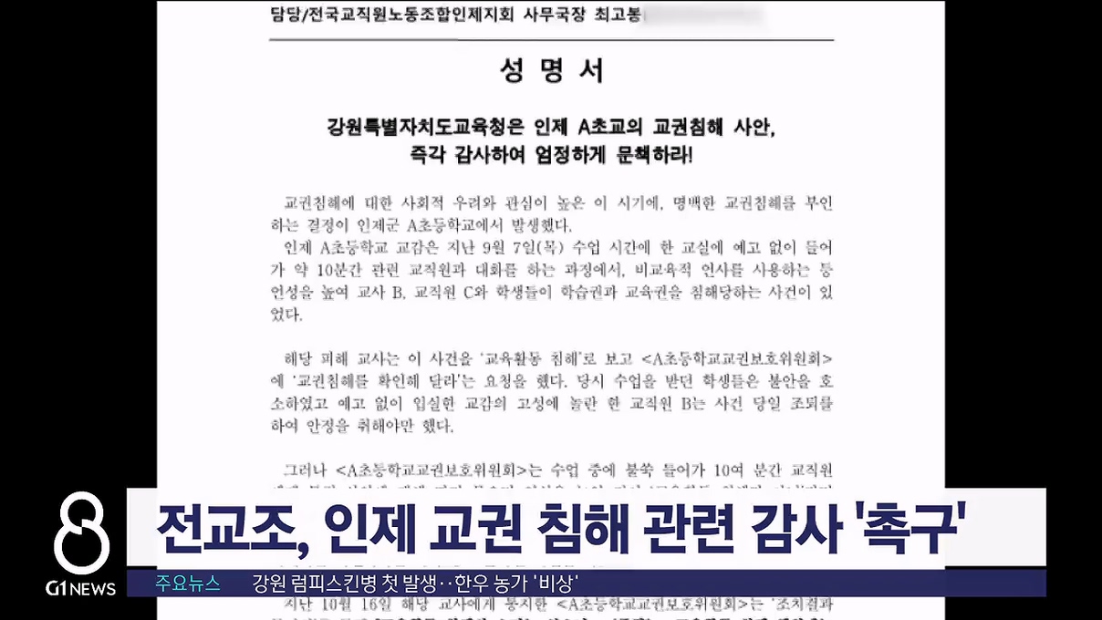 전교조 인제지회는 성명서를 발표하고 인제의 한 초등학교에서 발생한 교권 침해 신고와 관련해, 도교육청의 감사를 촉구했습니다.
