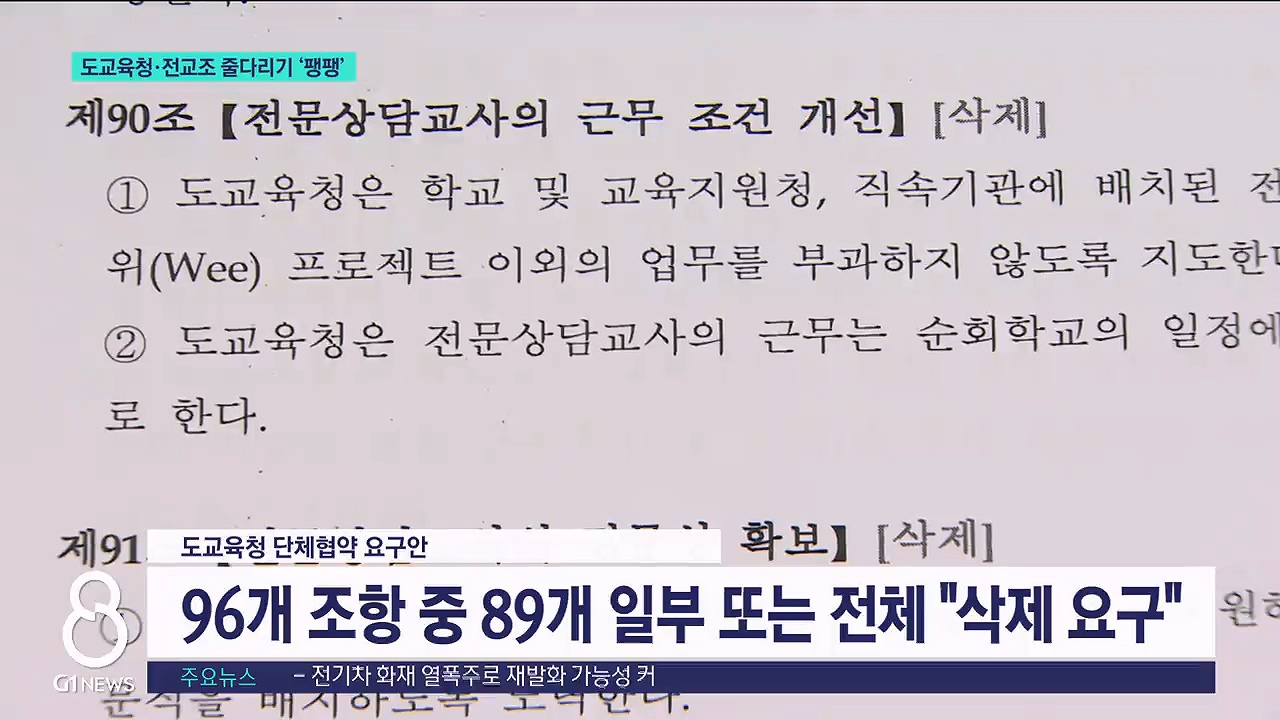 전교조 강원지부와 맺은 96개 조항 가운데 89개 조항의 일부 또는 완전 삭제 요구가 담겼습니다.