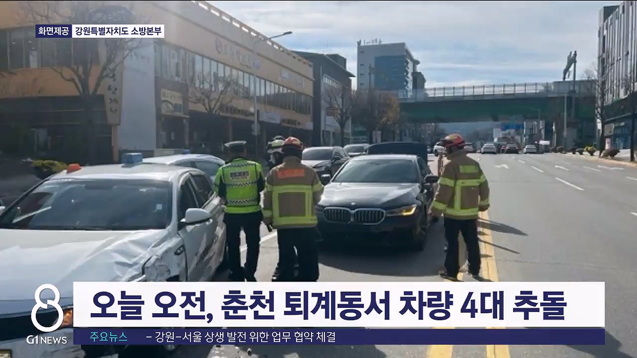 오늘(8일) 오전 11시 58분쯤 춘천시 퇴계동의 한 도로에서 차량 4대가 잇따라 추돌하는 사고가 발생했습니다.