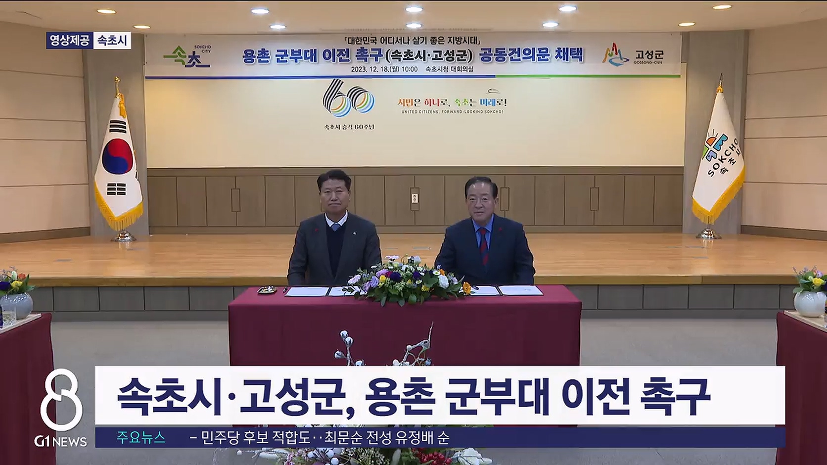 양 지자체는 오늘(18일) 속초시청 대회의실에서 고성군 용촌리 군부대 이전을 촉구하는 공동 건의문을 채택했습니다.