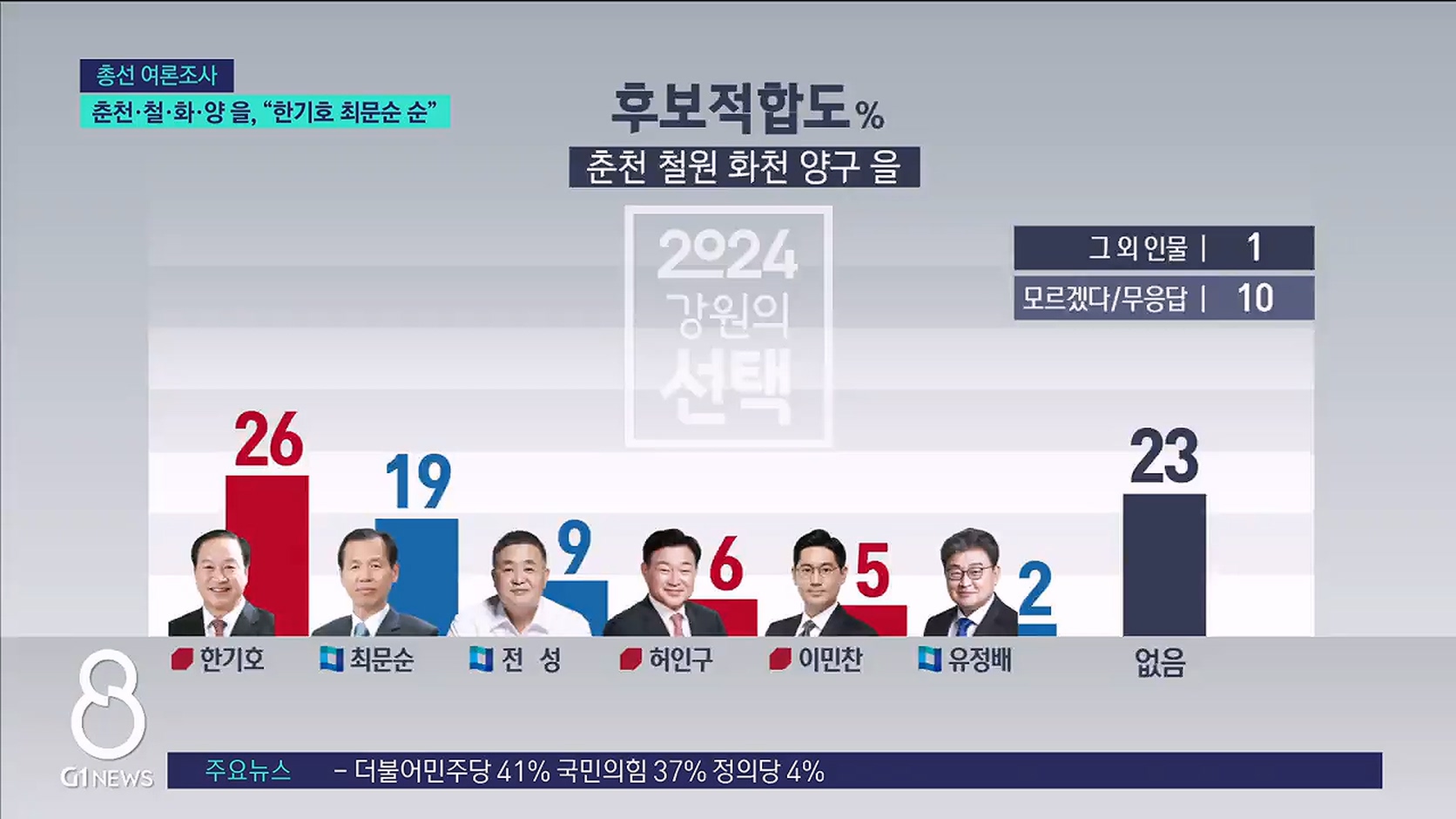 최문순 전 강원도지사 19%, 전성 변호사 9%, 허인구 전 G1방송 대표이사 6%, 이민찬 국민의힘 상근부대변인 5%, 유정배 전 대한석탄공사 사장이 2%를 기록했습니다.