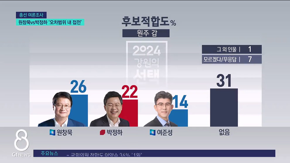 원창묵 전 원주시장 48%, 여준성 전 대통령비서실 비서관이 23%로 나왔고,