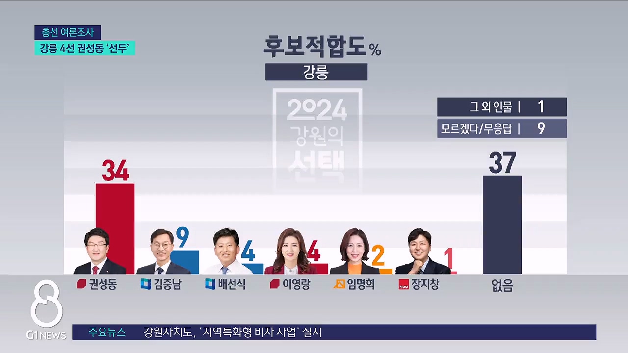 /권성동 국민의 힘 국회의원이 34%로 선두, 김중남 더불어민주당 도당 탄소중립특별위원장이 9%로 뒤를 이었습니다.