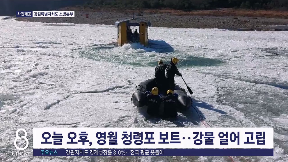 오늘 오후 12시 22분쯤 한파로 평창강이 얼어붙으면서 청령포 관광객 수송배가 강을 건너다 얼음에 걸려 고립됐습니다.