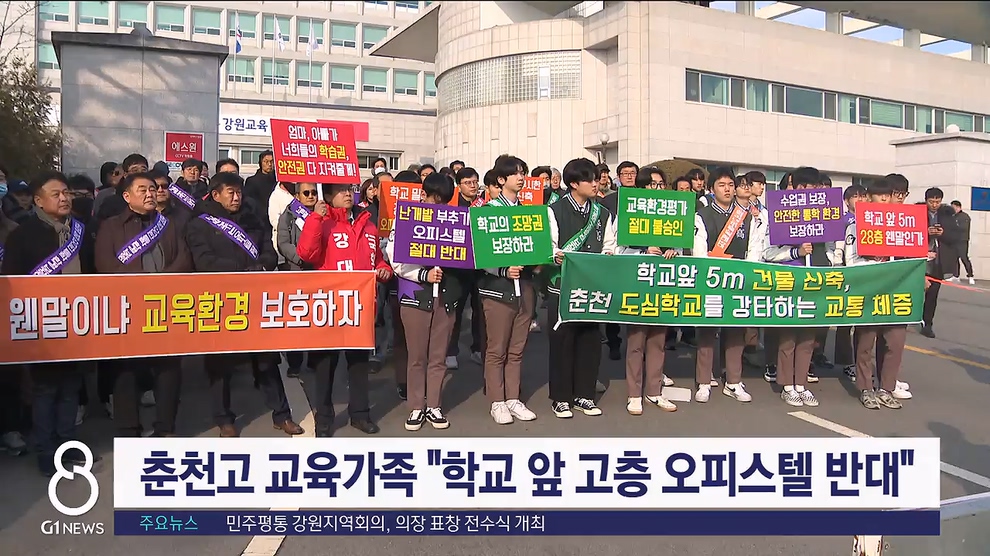 춘천고등학교 앞 고층 오피스텔 신축 사업과 관련해, 춘천고 학생과 동문, 학부모 등이 오늘(26일) 도교육청 앞에서 교육환경사수 총궐기대회를 열었습니다.