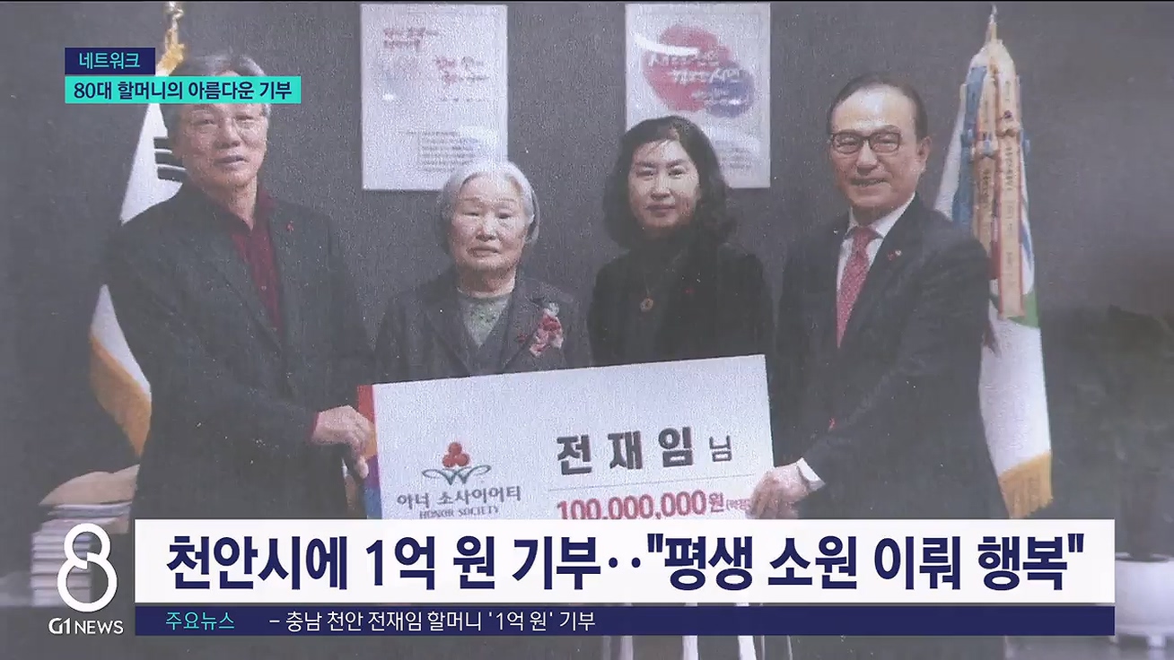 전씨 할머니는 최근 천안시에 1억원을 기부하며 고액 기부자 모임인 충남 아너 소사이어티에 122번째로 이름을 올렸습니다.