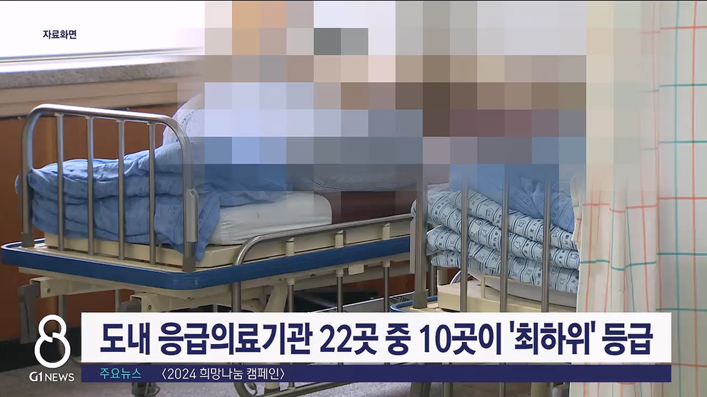 보건복지부가 2022년 7월부터 지난해 6월까지 전국 412개 응급의료기관의 응급의료서비스 수준을 평가한 결과, 도내 응급의료기관 22곳 중 10곳이 최하위 등급을 받았습니다.