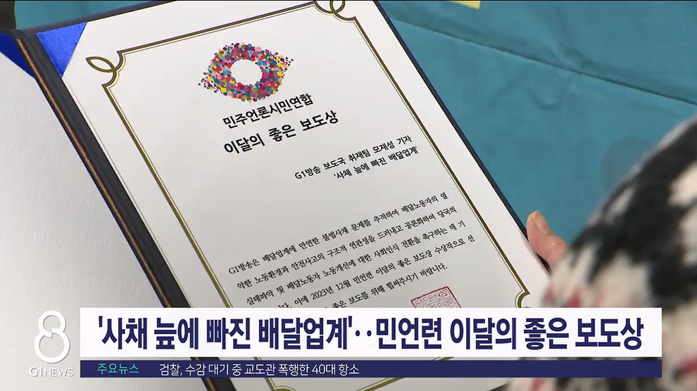G1방송의 '사채 늪에 빠진 배달업계' 연속보도가 민주언론시민연합의 이달의 좋은 보도상을 수상했습니다.
