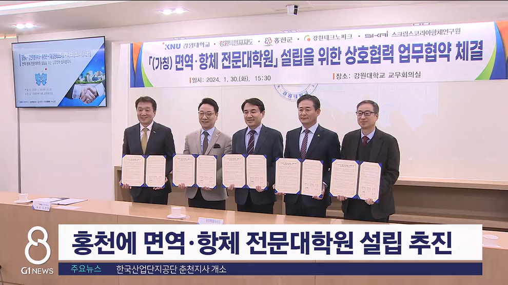 강원특별자치도와 홍천군, 강원테크노파크와 스크립스코리아항체연구원 등은 오늘(30일) 강원대 교무회의실에서 '면역·항체 전문대학원 설립을 위한 다자간 업무협약'을 체결했습니다.