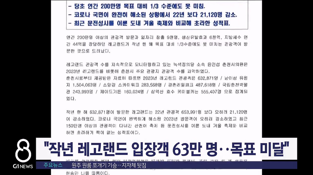 녹색정의당 윤민섭 춘천시의원은 보도자료를 내고 "춘천시에 따르면 지난해 레고랜드 방문객이 63만 명으로 집계, 당초 목표인 200만 명에 미치지 못했다"고 지적했습니다.