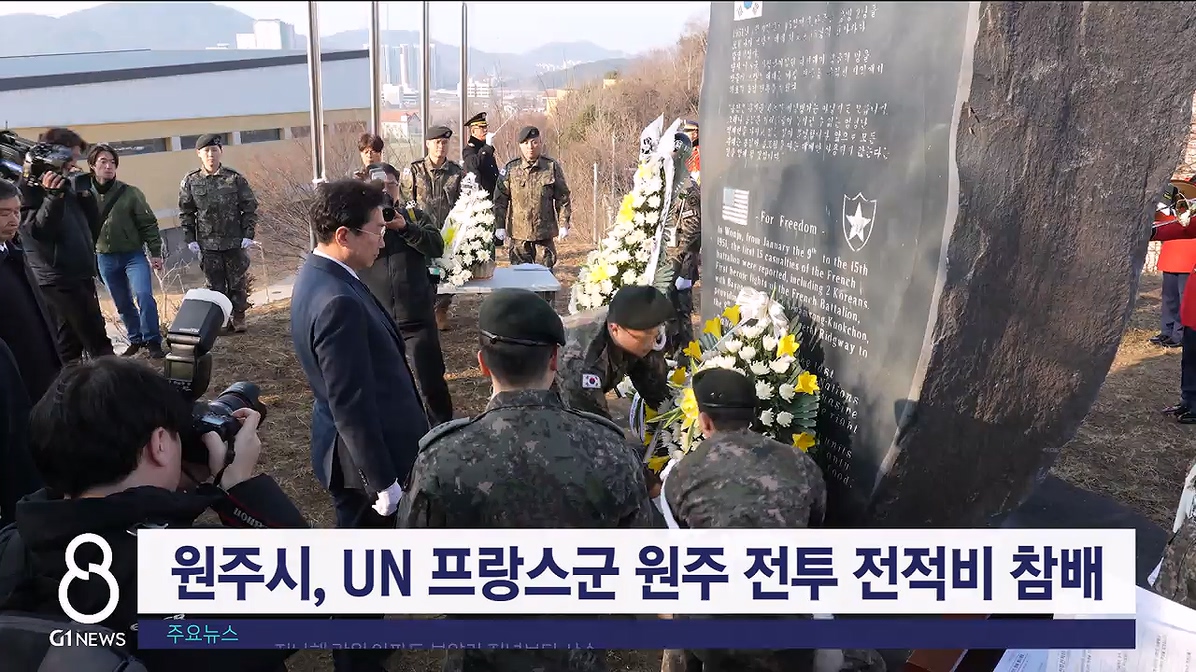 한국전쟁에 참전한 UN 프랑스군의 원주지구 전투 전적비에서 오늘(8일) 참배 행사가 열렸습니다.