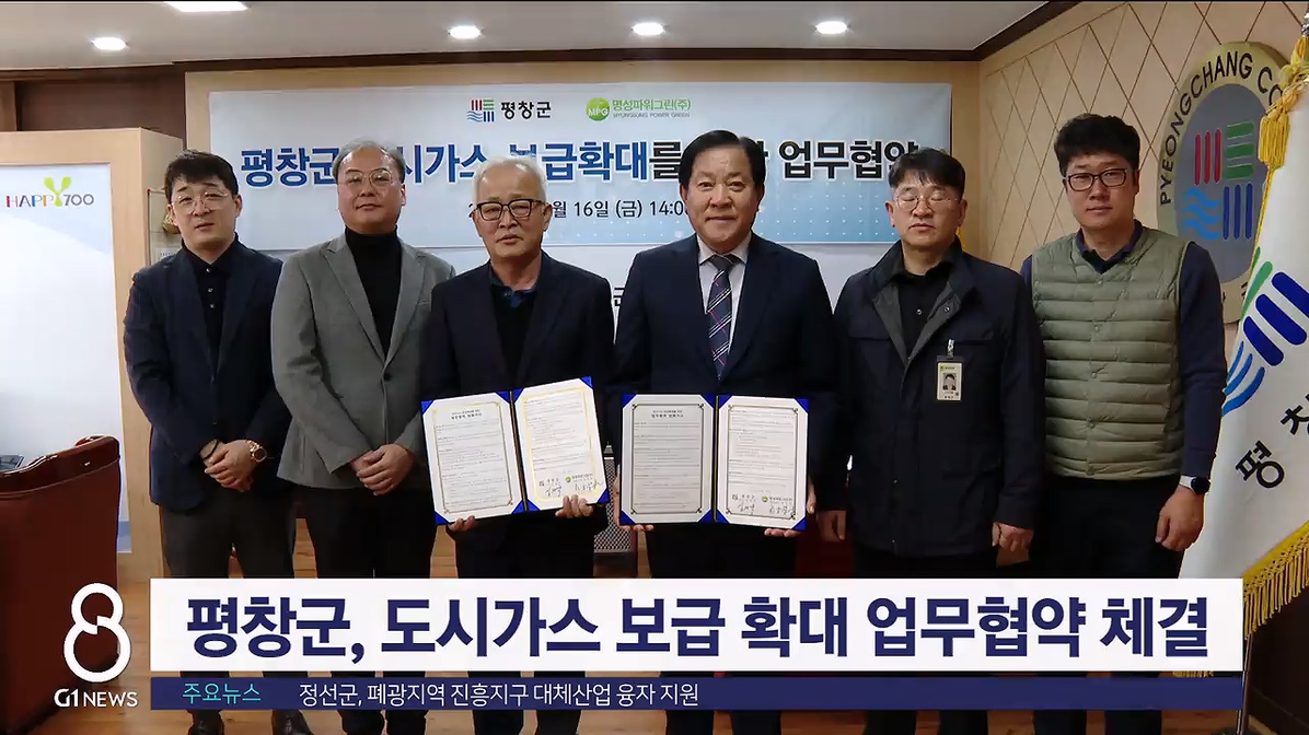 평창군은 오늘 명성파워그린 주식회사와 업무협약을 맺고, 오는 2030년까지 미탄면과 방림면을 제외한 6개 읍·면에 도시가스를 공급하는데 협력하기로 했습니다.