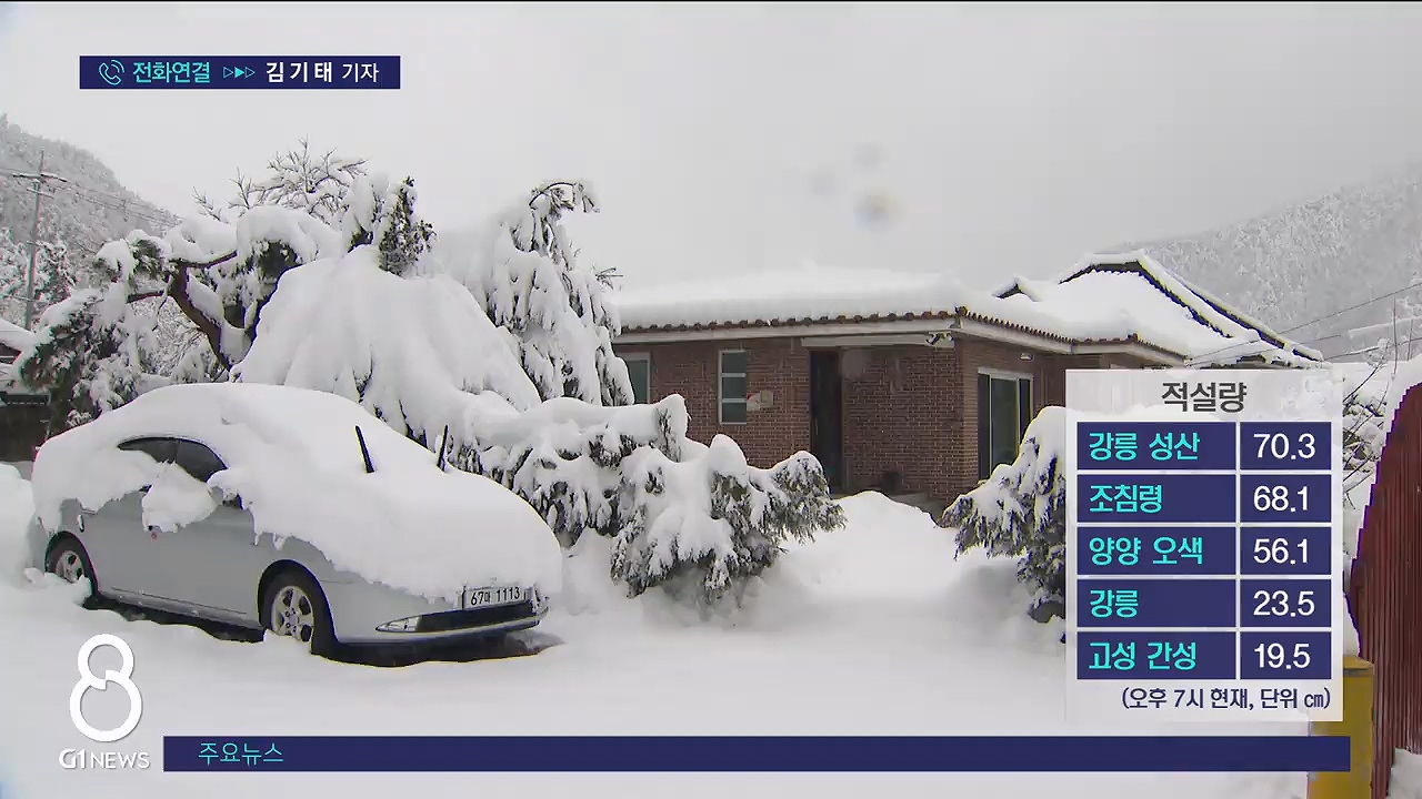지난 20일부터 오늘 오후 7시까지 내린 눈의 양은 강릉 성산 70.3cm, 조침령 68.1cm, 양양 오색 56.1cm, 강릉 23.5cm, 고성 간성 19.5cm 등입니다.
