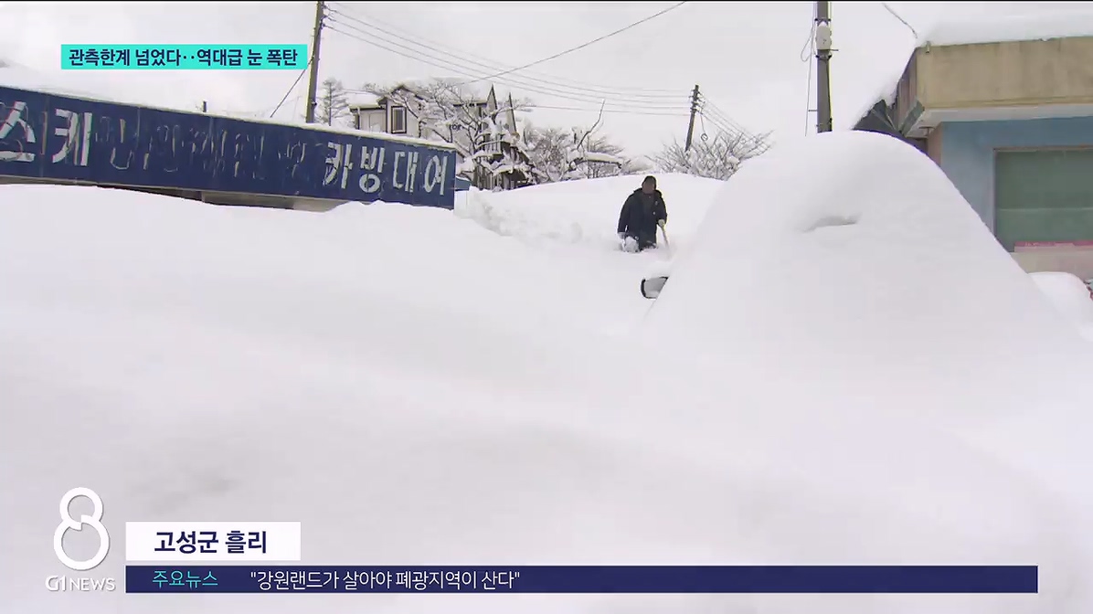 나흘째 이어진 눈 폭탄에 고성 향로봉에는 기상관측 장비의 한계 수준을 넘은 1.5m에 가까운 눈이 쌓이면서 관측이 중단됐고,