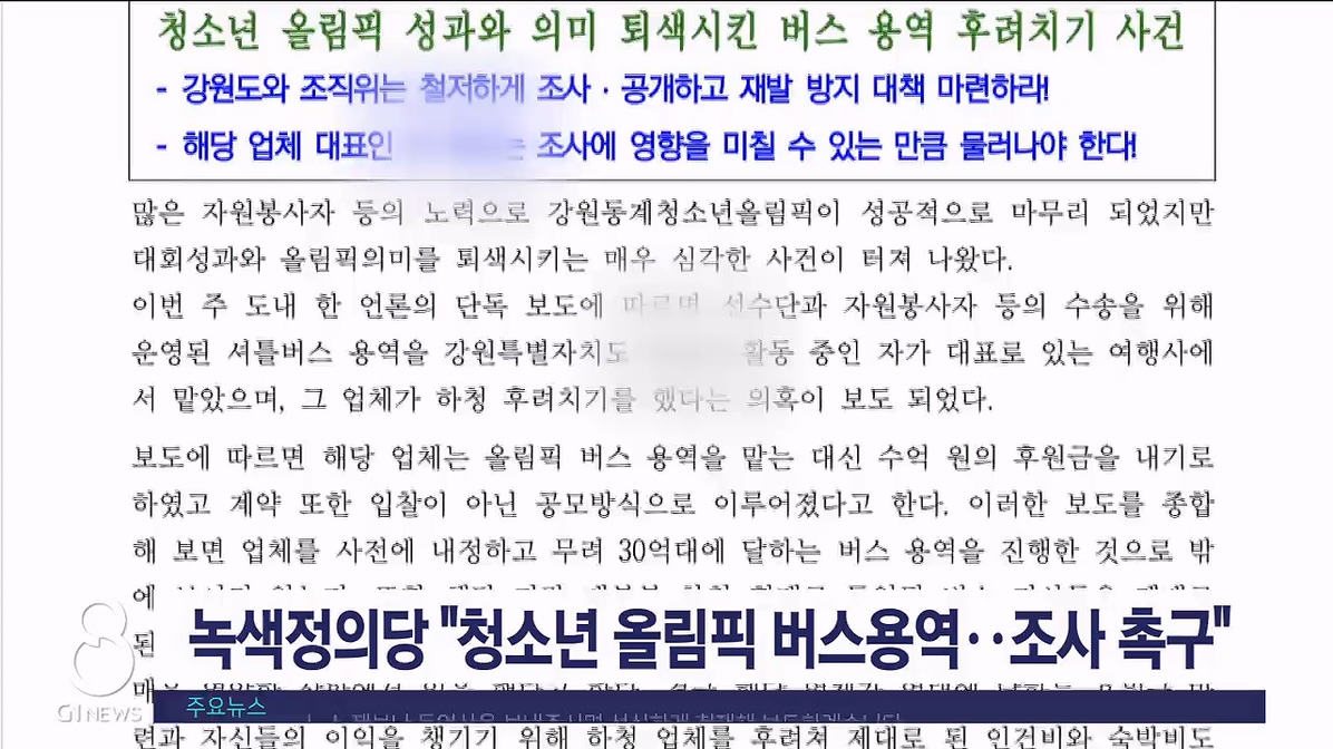 지난주 G1뉴스가 보도한 '강원동계청소년올림픽 버스 임차 용역 논란'과 관련해 정치권에서도 철저한 진상조사를 요구했습니다.