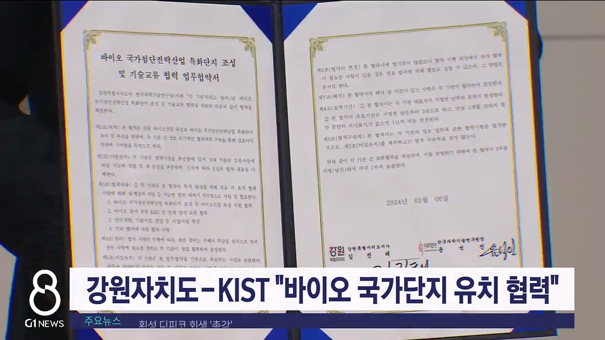 강원자치도와 한국과학기술연구원 KIST는 오늘(6일) 도청에서 '강원 바이오 첨단전략산업 특화단지 조성과 기술교류를 위한 업무협약을 체결했습니다.