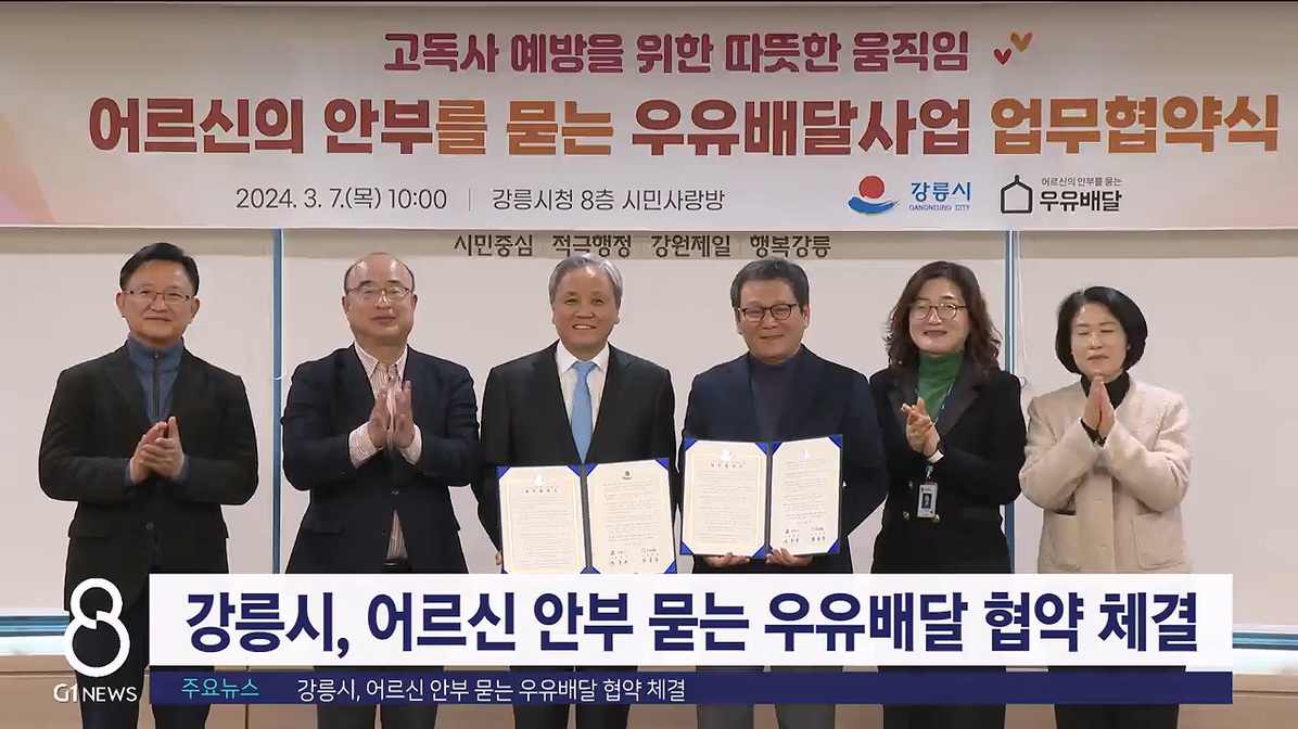 강릉시는 사단법인 어르신의 안부를 묻는 우유배달과 업무 협약을 체결하고, 지역 독거 어르신 100명에게 주 3회 우유 배달을 통해 건강과 신변 이상 여부 등을 확인하기로 했습니다.