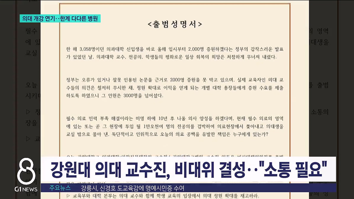 한편 강원도는 도내 4개 대학병원에 8억 원을 지원해 의사들의 당직 수당을 지원한다고 밝혔지만,