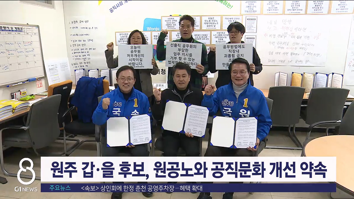 4월 총선을 앞두고 원주 갑·을 선거구 여야 후보들과 원주시청 공무원노조가 '갑질 근절·클린 공직문화 실천' 협약을 맺었습니다.
