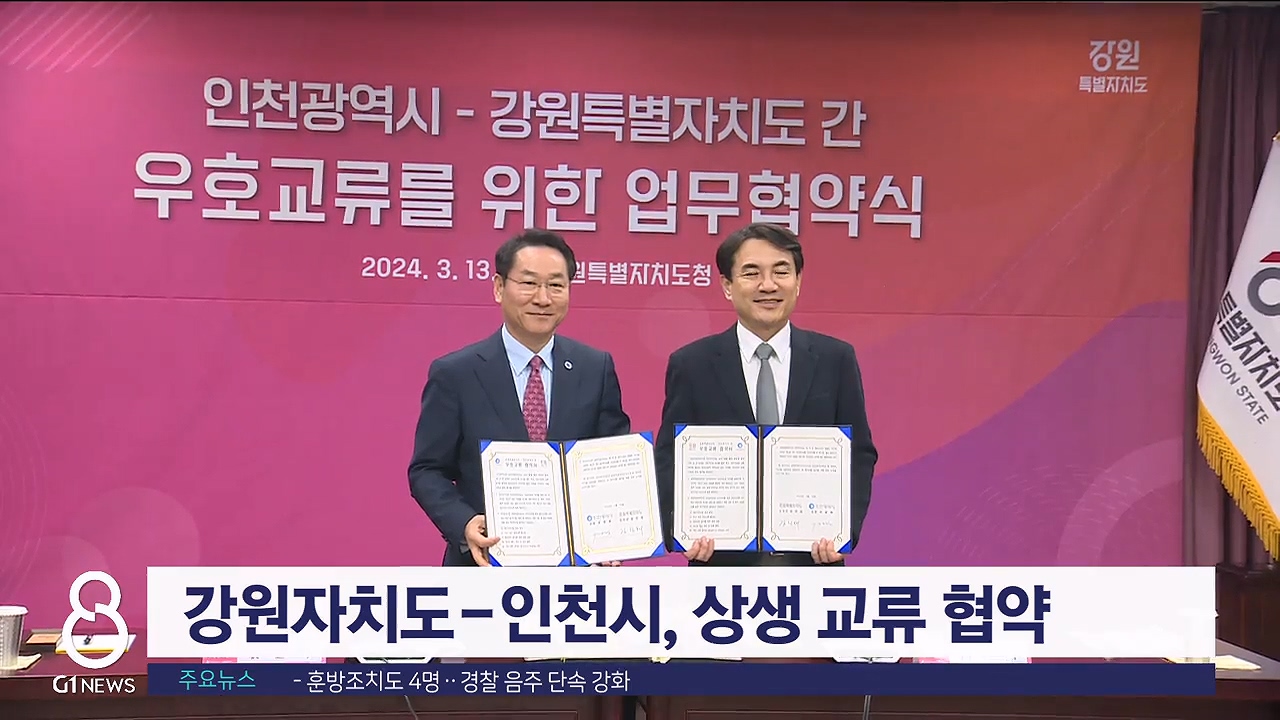 강원자치도와 인천광역시가 오늘(13일) 도청에서 '상생발전을 위한 우호교류 업무 협약'을 체결했습니다.