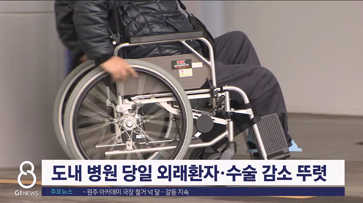 전공의 이탈이 계속되고 있는 가운데, 의료진 부족과 경증 환자의 방문 감소로 인해 도내 종합병원의 외래환자 수와 수술 건수가 감소한 것으로 나타났습니다.