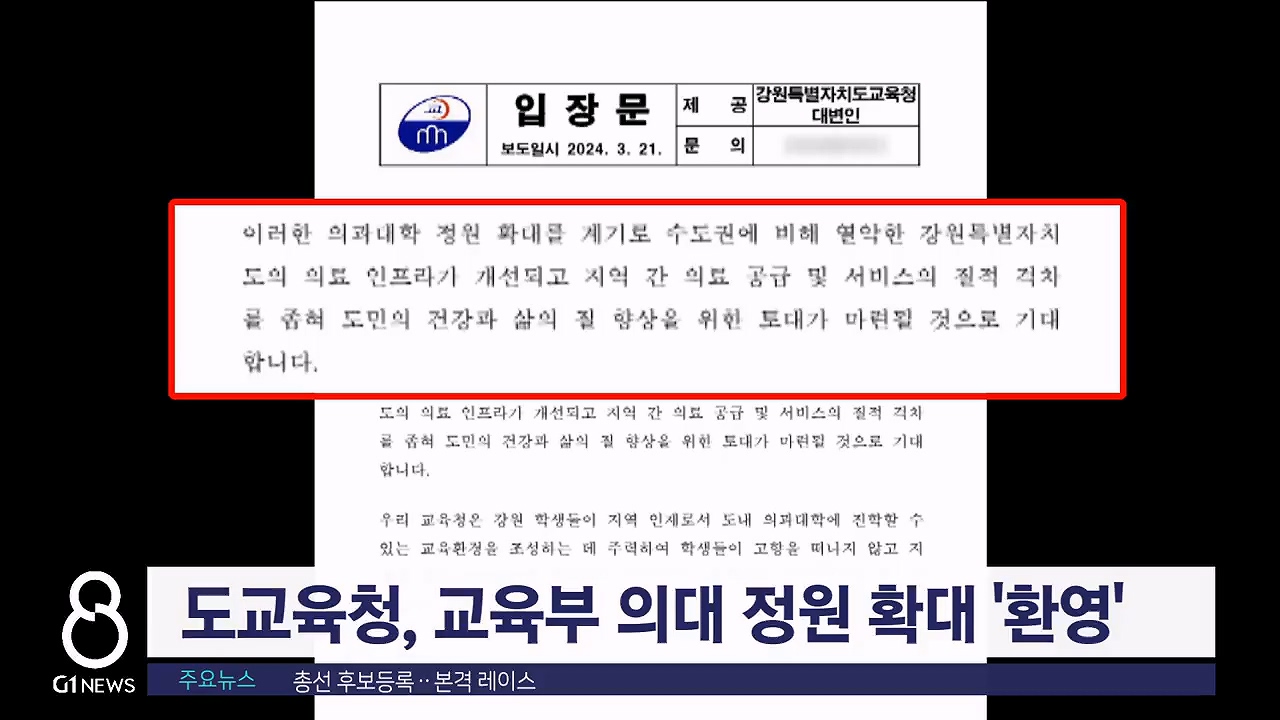 강원자치도교육청이 교육부가 발표한 2025학년도 의과대학 학생 정원 대학별 배정 결과에 환영한다는 입장을 내놨습니다.