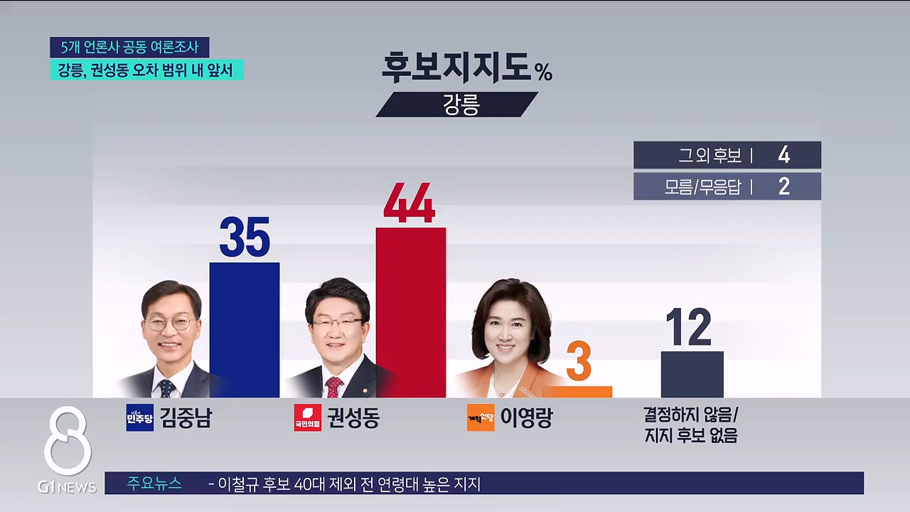 국민의힘 권성동 후보가 44%로 가장 높게 나왔고, 더불어민주당 김중남 후보는 35%의 지지도를 보였습니다.