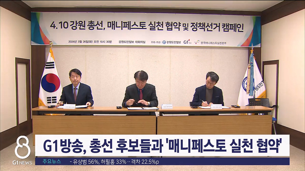 G1방송과 강원도민일보, 한국매니패스토 실천본부는 오늘(26일) 춘천철원화천양구 갑·을 선거구 후보자들과 여야 정당 관계자들이 참석한 가운데 '정책선거 실천 협약'을 맺었습니다.