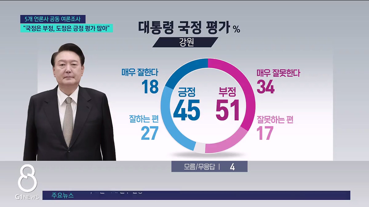국정 지지도는 부정 평가가 많은 반면, 도정에 대해선 도민들의 지지가 절반을 넘었습니다.