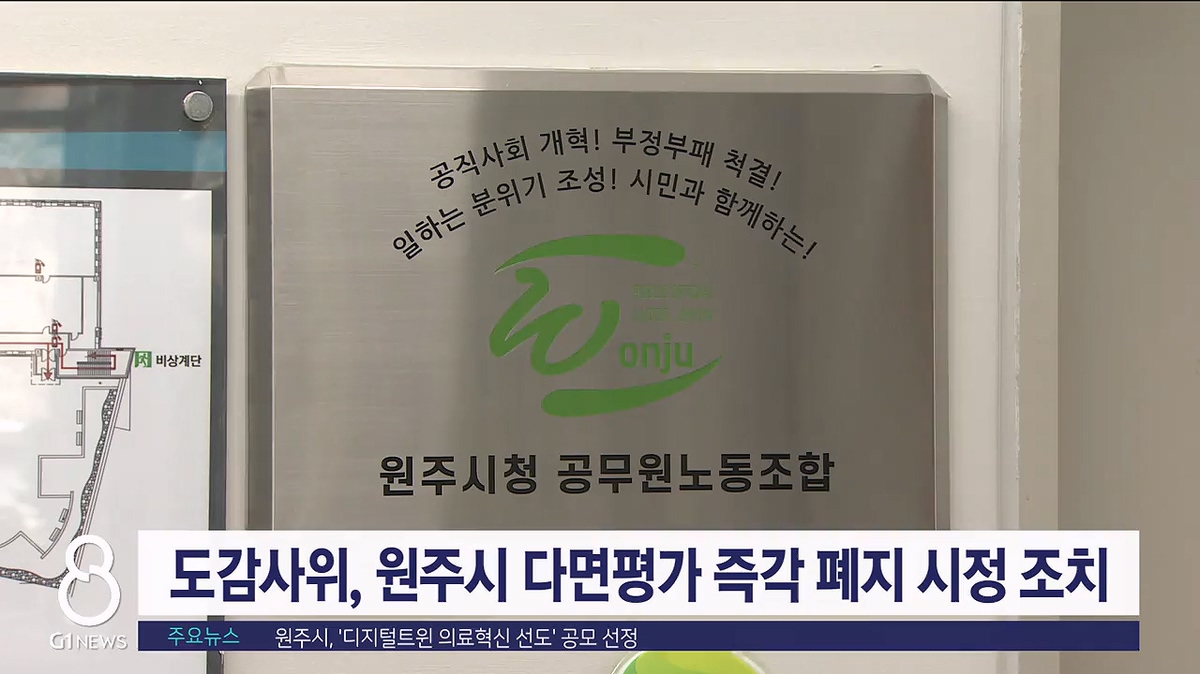 원주시 공무원노조에 따르면 도 감사위원회는 최근 원주시가 승진 임용 변경시 유예기간 1년을 지키지 않고 다면평가를 즉각 폐지한 것에 대해 시정 조치했습니다.