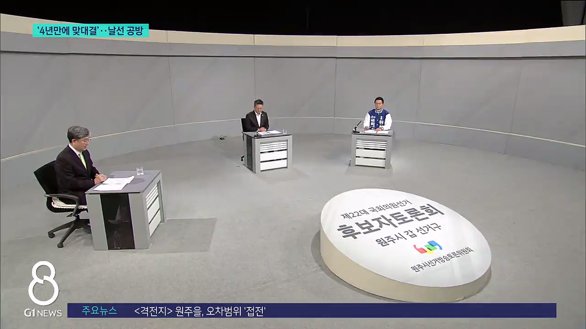 리턴매치이자 최대 격전지로 관심을 끌고 있는 원주 갑 선거구 정책 토론회가 열렸습니다.