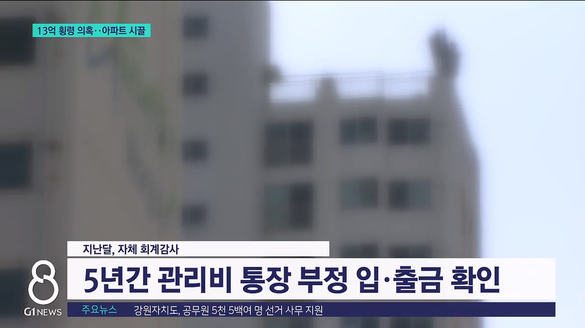원주의 한 아파트에서 경리를 담당하는 직원이 5년에 걸쳐 13억 원의 관리비를 횡령했다는 의혹이 제기됐습니다.
