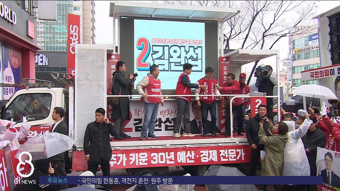 "한 위원장은 원주에 가장 필요한 사람들을 뽑아달라며, 원주 갑과 을에 각각 출마한 박정하, 김완섭 후보에 대한 적극적인 지지를 호소했습니다."