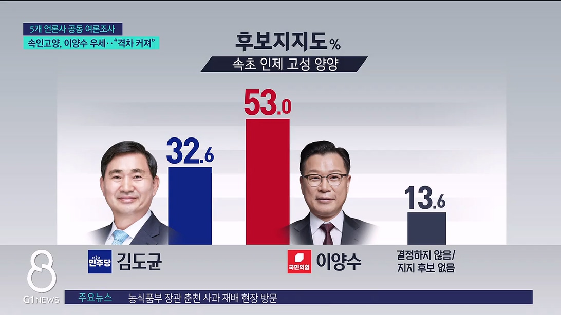 국민의힘 이양수 후보가 50%가 넘는 지지도를 얻으며,